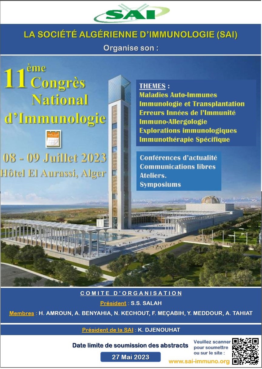 La Societe Algérienne d'Immunologie a le plaisir de vous informer de l'organisation, à l'Hotel l'Aurassi à Alger, les 08 et 09 juillet 2023, du 11ème Congrès National d'Immunologie. Ces journées scientifiques seront consacrées aux thématiques suivantes :